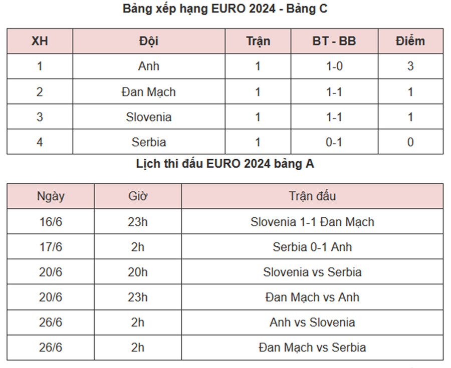 Bảng C EURO 2024 có các đội tuyển Anh, Serbia, Slovenia và Đan Mạch.