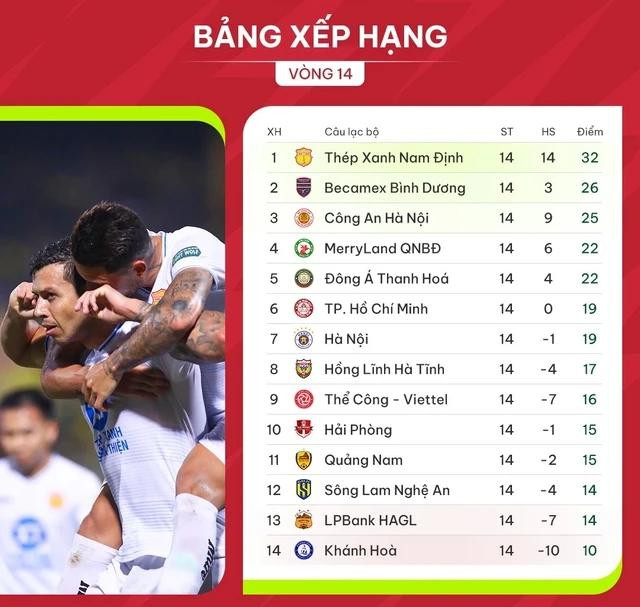 Quật ngã CLB Hà Nội ngay trên sân Hàng Đẫy bằng bàn thắng ở phút cuối trận đấu của Lucas Alves giúp CLB Nam Định có thêm 3 điểm quý giá, nâng tổng số điểm đạt được sau vòng 14 V-League 2023-2024 lên 32 điểm, giữ vững ngôi đầu bảng xếp hạng.