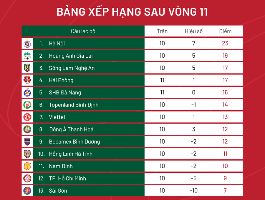 Bảng xếp hạng sau vòng 11 V-League 2022: