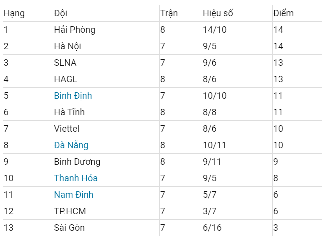 Hà Nội FC tăng tốc mạnh mẽ sau 2 chiến thắng liên tiếp trước Hải Phòng rồi Sài Gòn FC. Với 14 điểm, Hà Nội FC bằng điểm với Hải Phòng nhưng tạm xếp nhì, sau đối thủ vì kém hiệu số phụ. Tuy nhiên Hà Nội FC còn ưu thế khi đá ít hơn đối thủ 1 trận.