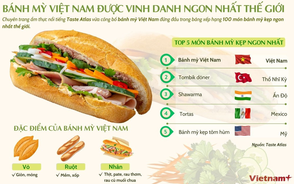 Bánh mỳ Việt Nam có đặc trưng là phần vỏ giòn, mỏng, ruột mềm và xốp, phần nhân bánh thường có thịt, pate, rau thơm, rau củ muối chua và ớt xanh thái sợi; tùy mỗi vùng miền lại có cách biến tấu phần nhân khác nhau.