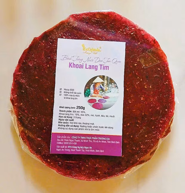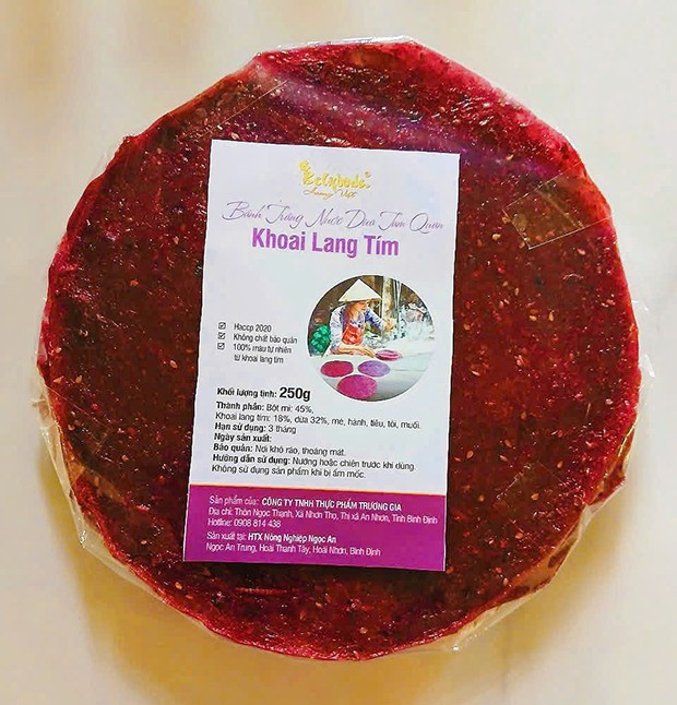 Bánh tráng nước dừa Tam Quan khoai lang tím là một sản phẩm độc đáo của HTX Nông nghiệp Ngọc An (TX Hoài Nhơn) phối hợp với Công ty TNHH Thực phẩm Trường Gia (TX An Nhơn), không chỉ góp phần bảo tồn nghề truyền thống mà còn giúp người dân địa phương nâng cao thu nhập. Sản phẩm mang đậm hương vị dân dã, là món quà quê ý nghĩa, vừa ngon miệng vừa thể hiện tình cảm chân thành của người tặng.