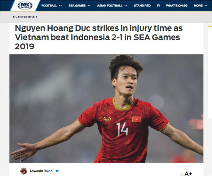 Trang thể thao uy tín châu Á Fox Sports nhanh chóng giật tít "Hoàng Đức lập siêu phẩm giúp Việt Nam ngược dòng thắng đẹp mắt Indonesia" sau khi trận tranh ngôi đầu bảng B môn bóng đá nam SEA Games 30 giữa hai "ông lớn" Đông Nam Á kết thúc.