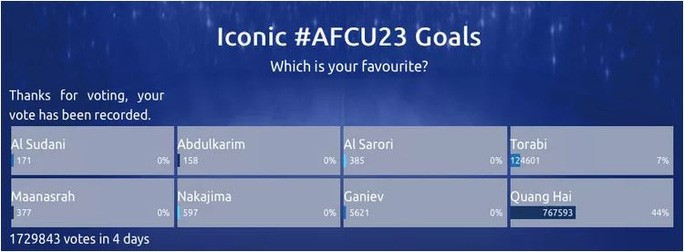 Thật bất ngờ, chỉ trong vòng chưa đầy 48 tiếng đồng hồ, từ vị trí thứ 2 trong danh sách bình chọn, bàn thắng của Quang Hải vươn lên vị trí số 1 với hơn 770 ngàn lượt. Người hâm mộ bóng đá châu Á, phần lớn tại Việt Nam đã nắm bắt thông tin về cuộc thi và nhanh chóng giúp Quang Hải thay đổi vị thế, trở nên "vô đối" so với 7 bàn thắng còn lại, vượt xa Mahdi Torabi (U23 Iran) xếp thứ 2 với gần 125 ngàn phiếu bầu.