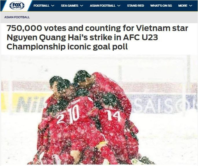Fox Sports cho biết bàn thắng mang tên "cầu vồng tuyết" của Nguyễn Quang Hải tại VCK U23 châu Á 2018 có đến hơn 750 ngàn lượt bình chọn trong cuộc thi về khoảnh khắc biểu tượng VCK U23 châu Á.