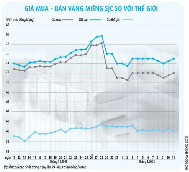 Chênh lệch giữa giá mua và bán vàng miếng SJC của các đơn vị kinh doanh vẫn cao, tới 2,5 triệu đồng/lượng, vàng nhẫn ở mức hơn 1 triệu đồng/lượng. Có thể thấy, cả vàng nhẫn và vàng miếng SJC vẫn đang neo ở mức rất cao. Trái hẳn với động thái lao dốc cuối tháng 12.2023 sau khi Thủ tướng yêu cầu Ngân hàng Nhà nước (NHNN) khẩn trương có giải pháp hiệu quả để quản lý, điều hành giá vàng miếng trong nước theo nguyên tắc thị trường, không để tình trạng chênh lệch giữa giá vàng miếng trong nước và vàng quốc tế ở mức cao, ảnh hưởng tiêu cực điều hành kinh tế vĩ mô, báo cáo kết quả thực hiện trong tháng 1.2024. Chỉ đạo được đưa ra khi vàng miếng SJC leo tới đỉnh hơn 80 triệu đồng/lượng, cao hơn vàng thế giới tới 20 triệu đồng/lượng.