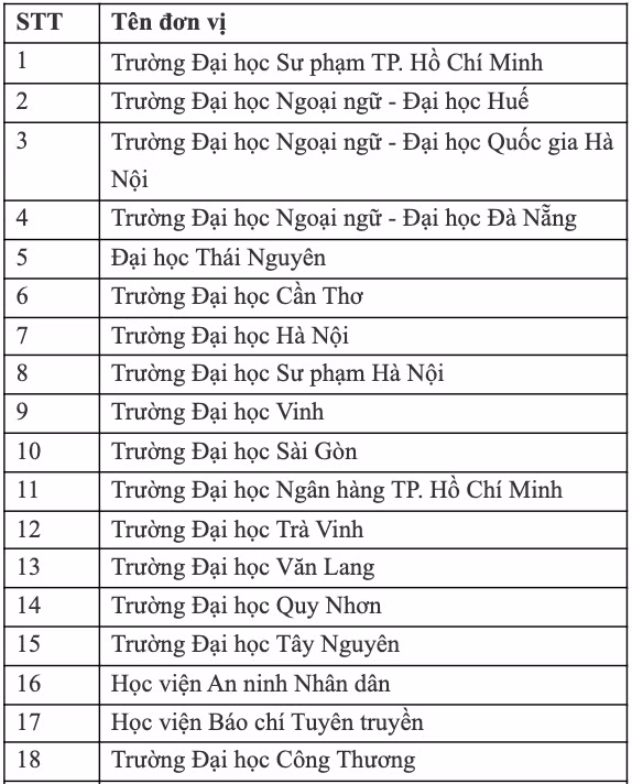 | Danh sách các cơ sở giáo dục ĐH được tổ chức thi đánh giá năng lực tiếng Anh theo Khung năng lực ngoại ngữ 6 bậc dùng cho Việt Nam cập nhật tới tháng 4.2024 (nguồn: BỘ GD-ĐT) |