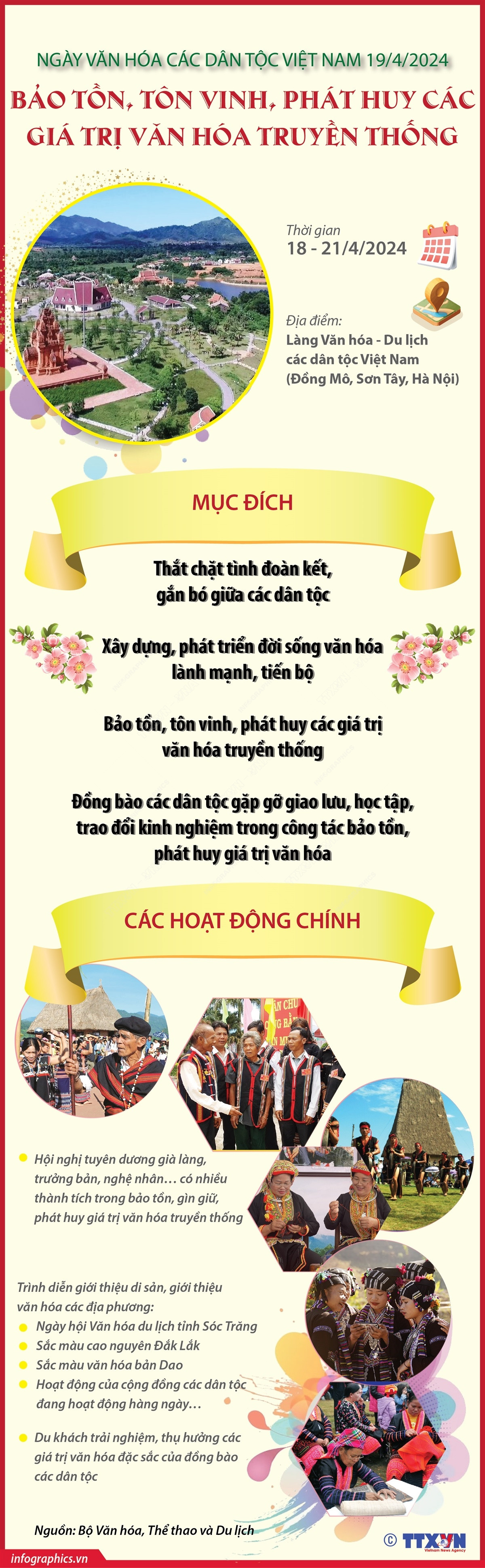 Ngày Văn hóa các dân tộc Việt Nam (19/4 hàng năm) là dịp để đồng bào các dân tộc được gặp gỡ giao lưu, học tập, trao đổi kinh nghiệm trong công tác bảo tồn, phát huy giá trị văn hóa truyền thống; thắt chặt tình đoàn kết gắn bó giữa các dân tộc; xây dựng và phát triển đời sống văn hoá lành mạnh, tiến bộ; các dân tộc góp phần bảo tồn, gìn giữ, tôn vinh và phát huy các giá trị văn hóa truyền thống của dân tộc.