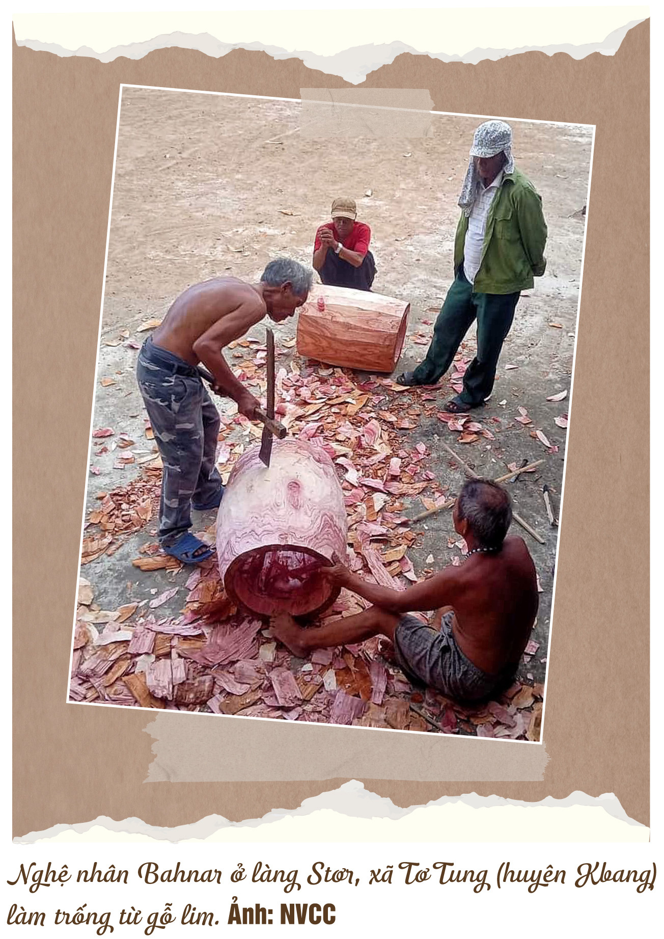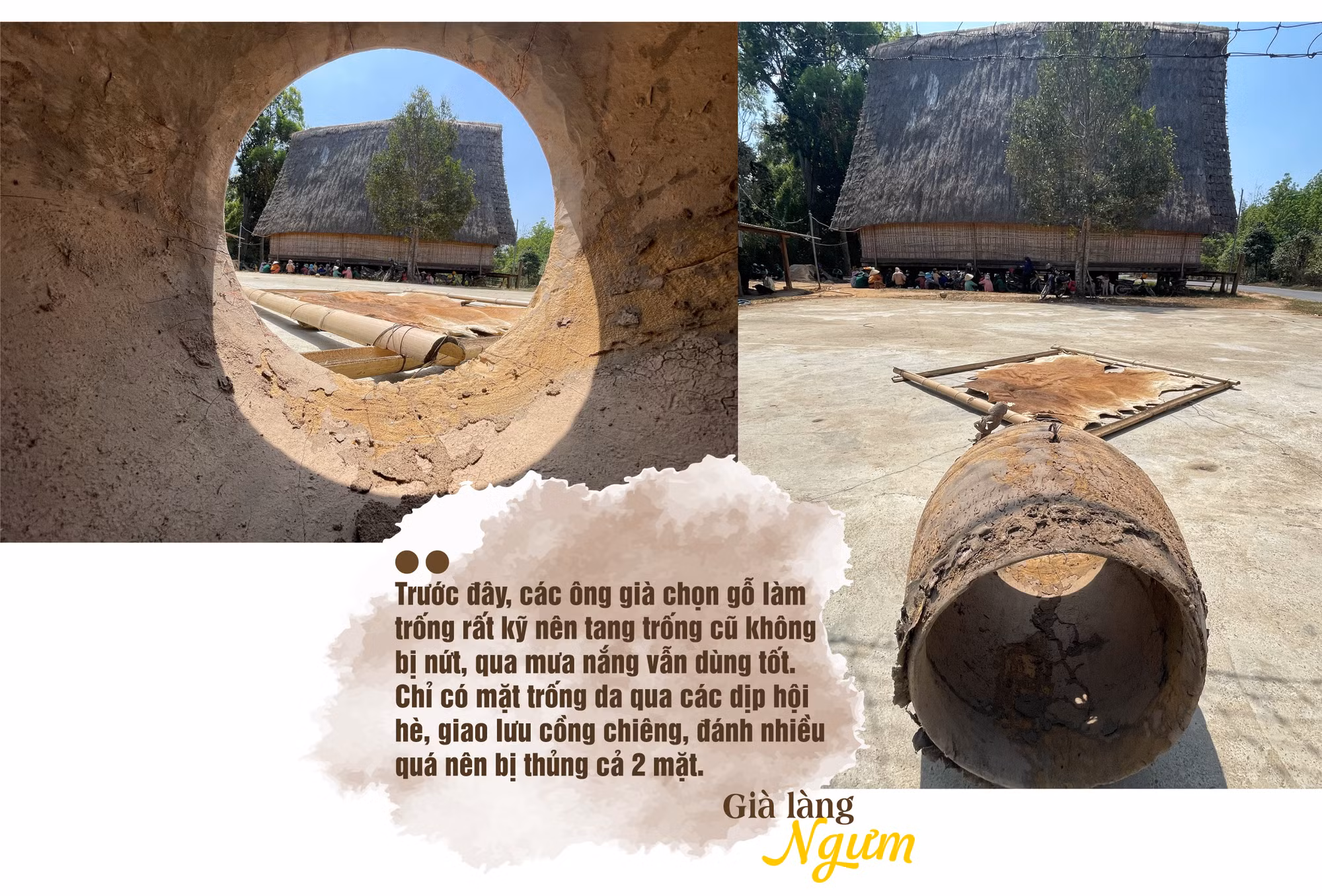 Nhắc đến chuyện làm trống, ông ghé tai một thanh niên nói nhỏ. Người thanh niên lấy xe máy chạy đi và lát sau đưa về cái tang trống cũ. Bên trong lẫn bên ngoài “xác trống” lộ rõ dấu vết thời gian, nhất là những mảng bùn đất. Tuy mặt trống bị hư nhưng làng mang cái tang trống đi “cất” dưới lòng suối để tránh bị hư hỏng. Già làng Ngưm-người tham gia việc làm trống-cho biết: