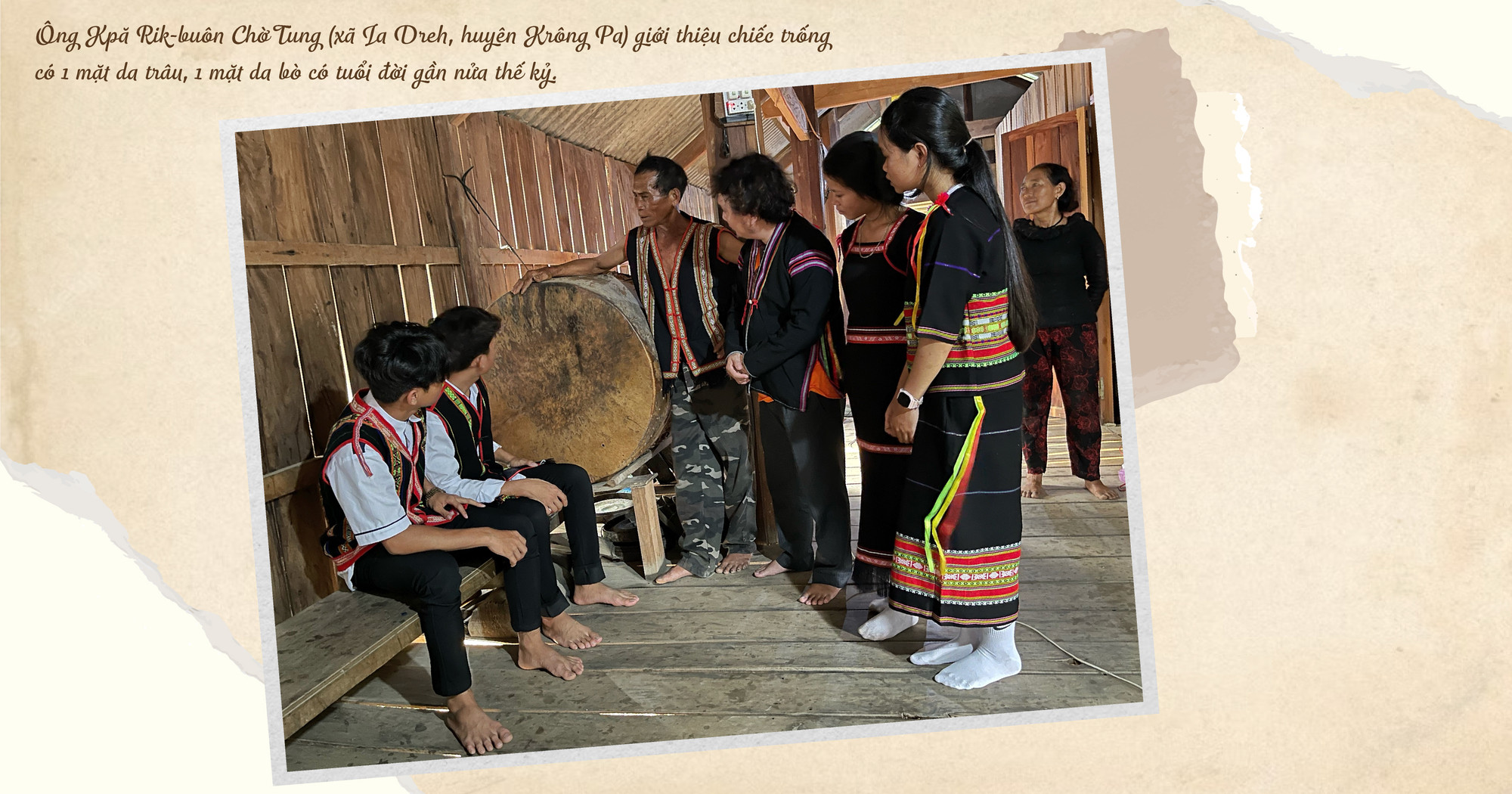 Trong căn nhà dài đặc trưng cho lối kiến trúc của người Jrai, ông Kpă Rik (buôn Chờ Tung, xã Ia Hdreh, huyện Krông Pa) vẫn còn lưu giữ nhiều loại trống da bò, da trâu kích thước lớn, nhỏ khác nhau. Nổi bật nhất là chiếc trống da có kích thước rất lớn đặt cố định sát vách nhà. Theo ông Rik, đây là cái trống kích thước lớn nhất trong vùng, được ông và cha mình làm ròng rã trong 2 năm mới xong. Trống có đường kính bề mặt hơn 80 cm, cao 1 m, nặng hàng trăm ký.