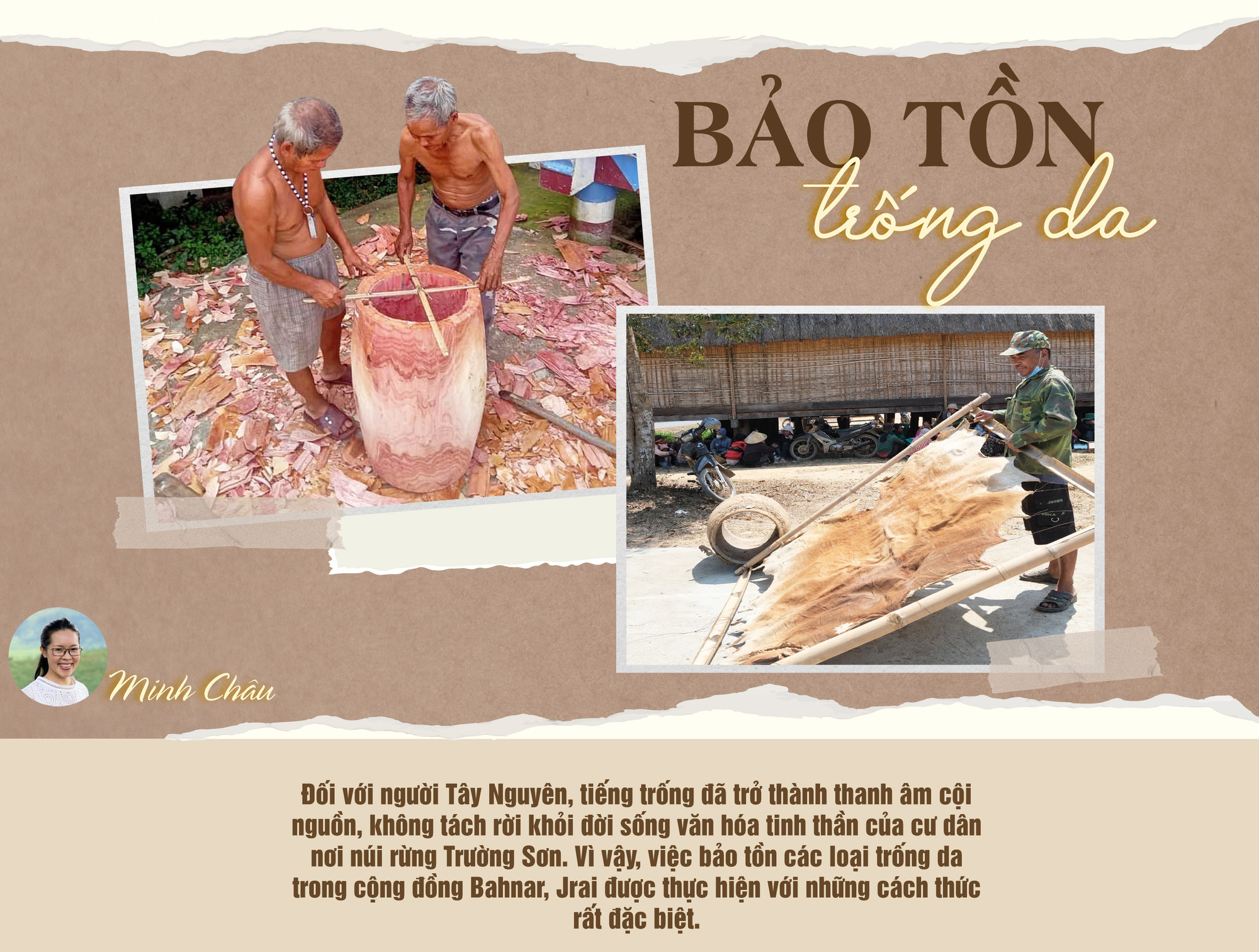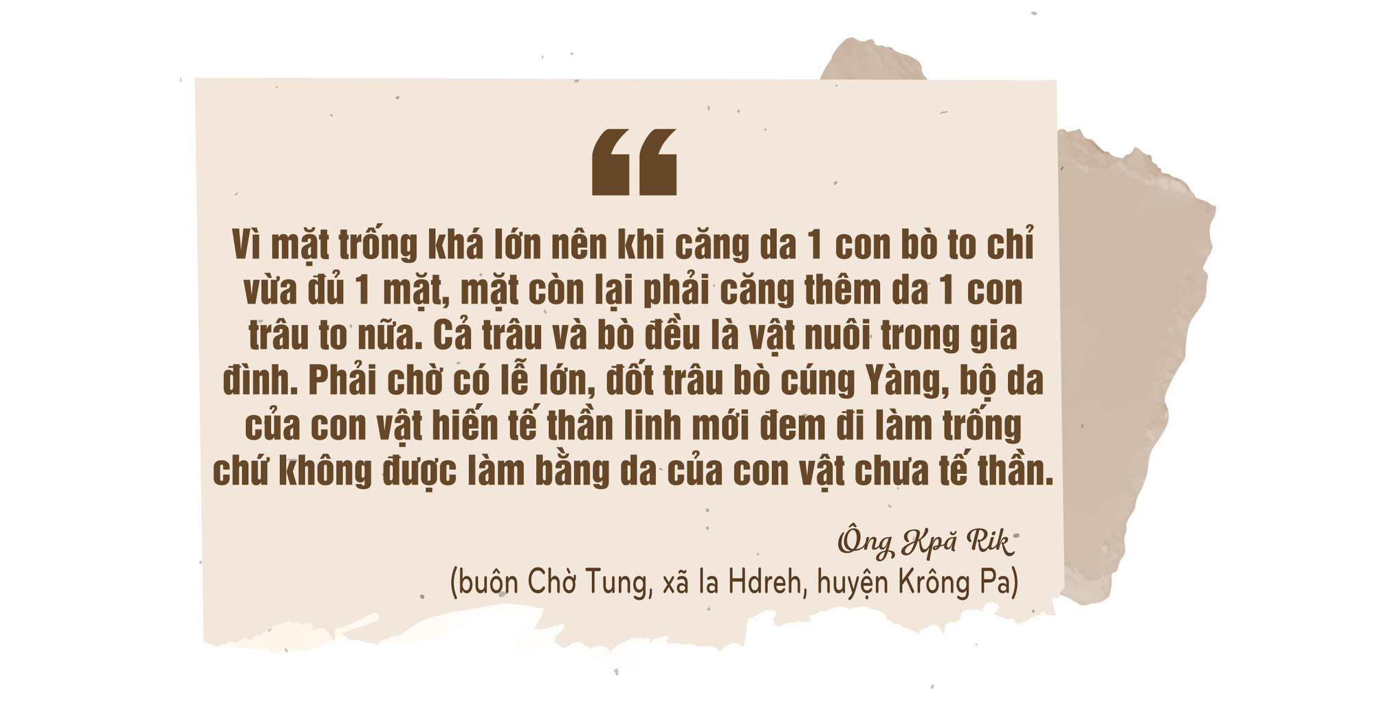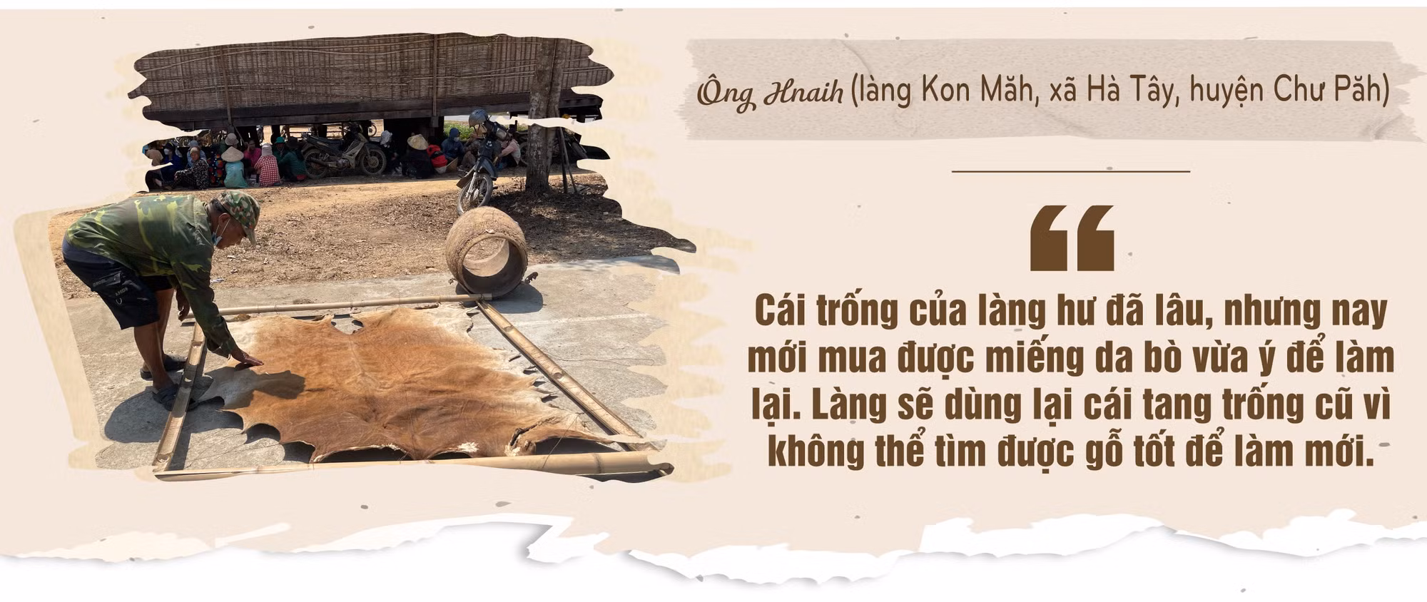 Trước sân nhà rông, ông Hnaih (làng Kon Măh, xã Hà Tây, huyện Chư Păh) lật qua lật lại kiểm tra độ khô của tấm da bò được căng trên một khung tre hình vuông. Tấm da phơi nhiều nắng to đã khô cong, nhưng theo ông, cần phơi thêm 1-2 nắng nữa mới đạt yêu cầu.