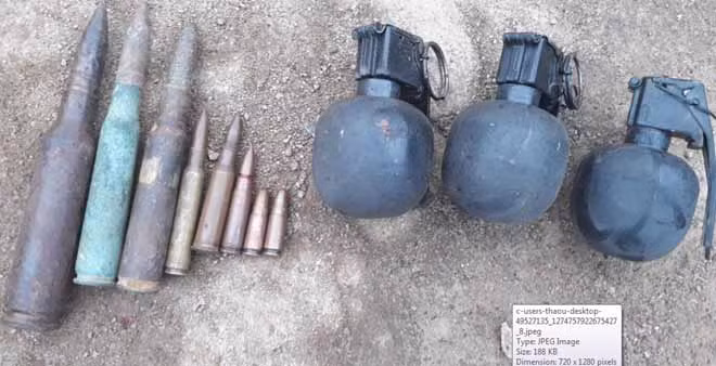 3 quả lựu đạn, 8 viên đạn, 2 dao nhọn được thu giữ tại nhà nghi phạm. ẢNH: CÔNG AN H.KON PLÔNG CUNG CẤP
