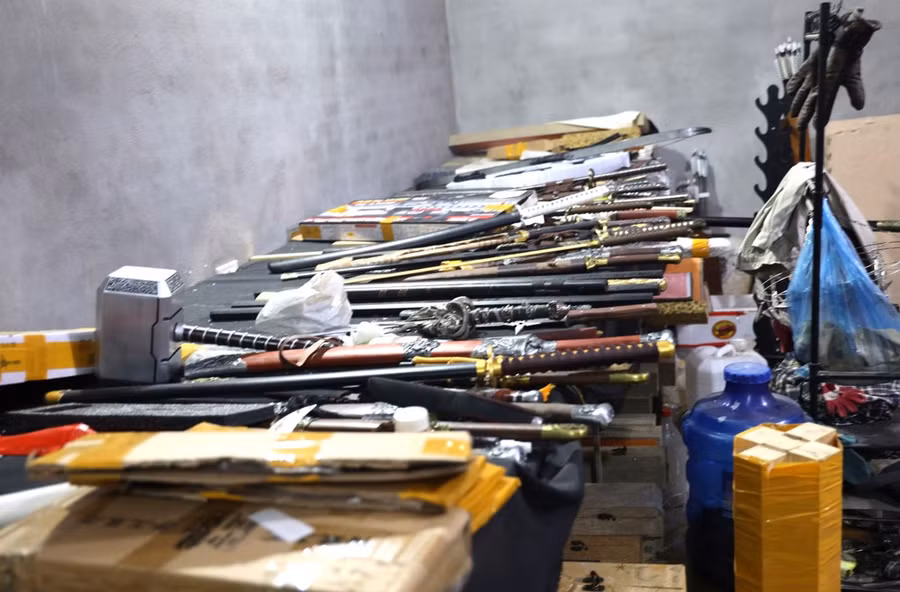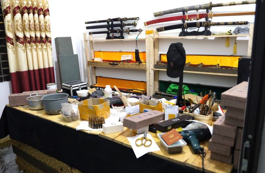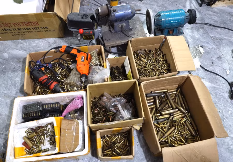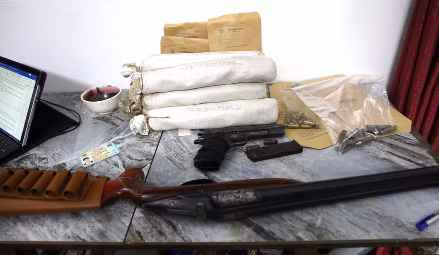 Tang vật thu giữ gồm 1 khẩu súng quân dụng, 1 khẩu súng săn, 1 hộp tiếp đạn, 5 quả lựu đạn (chưa kiểm tra bên trong, đối tượng khai nhận dùng để trưng bày câu “like” và bán), 83 viên đạn các loại, 1.000 vỏ đạn, 34kg đầu đạn và vỏ đạn các loại, 7 túi xác rắn đựng chất dẻo màu nâu có tổng trọng lượng 7kg nghi là thuốc nổ và nhiều dụng cụ để chế tạo đạn (đối tượng khai nhận sử dụng vỏ đạn, thuốc nổ và các nguyên liệu trên để chế tạo đạn). Ngoài ra, cơ quan công an còn phát hiện, thu giữ 73 dao, kiếm các loại...