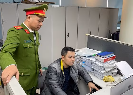 | Công an thi hành lệnh bắt giữ Giám đốc Trung tâm Đăng kiểm 50-17D. Ảnh: CHÍ THẠCH |
