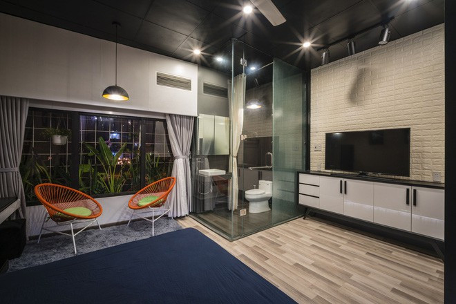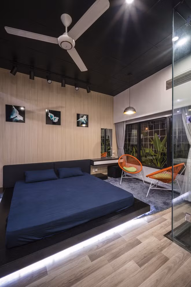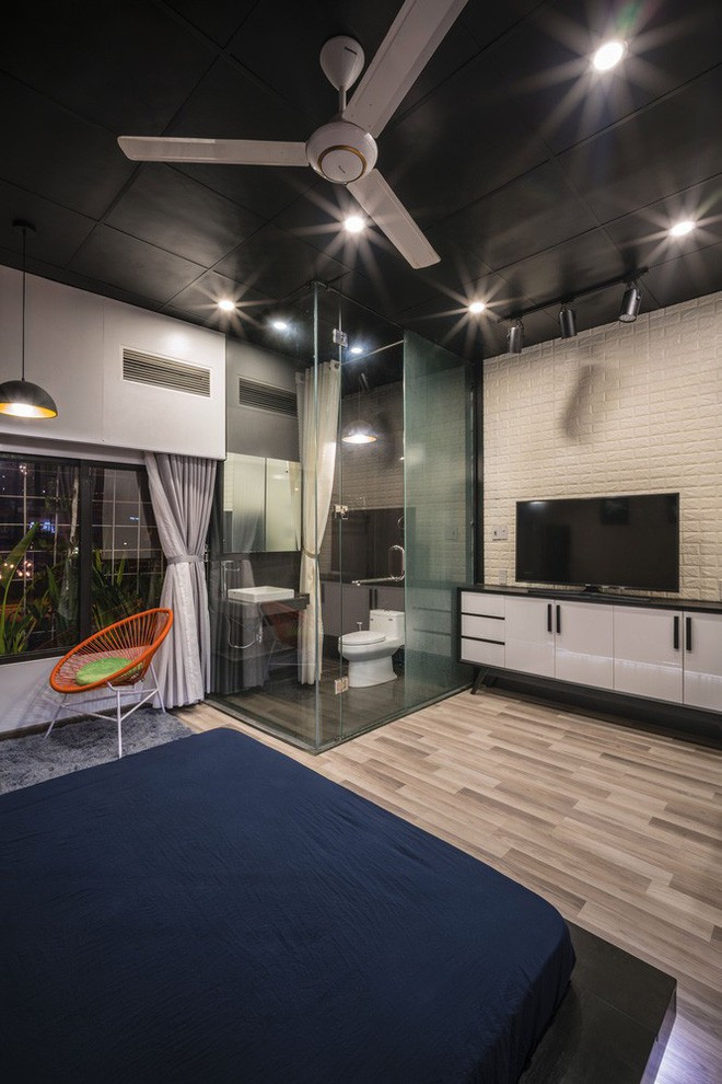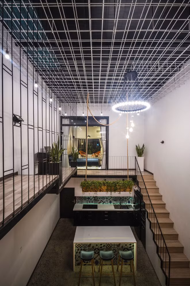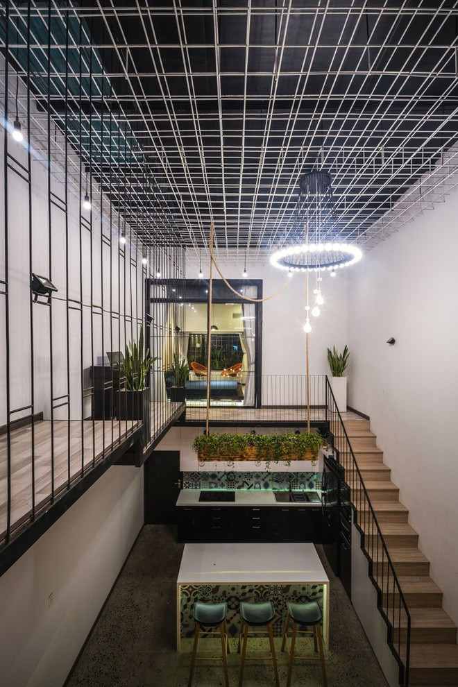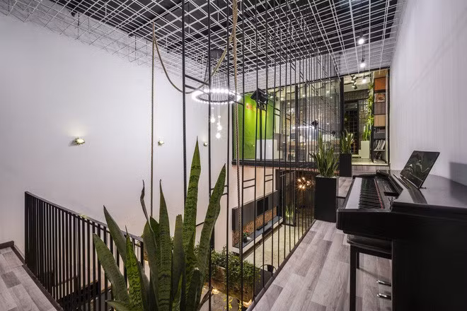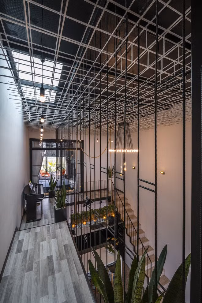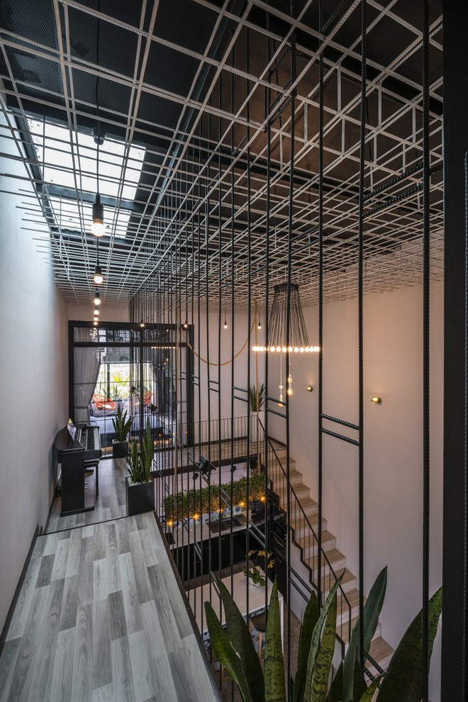 Tầng thứ hai là không gian ngủ và làm việc. 2 không gian này được phân tách bằng một hành lang dài. Để tạo sự kết nối và làm mềm không gian sử dụng nhiều chất liệu thép, các KTS đã đặt nhiều chậu cây xanh tại đây. Đồng thời trần nhà cũng được bổ sung khoảng giếng trời để lấy sáng cho ngôi nhà dạng ống.