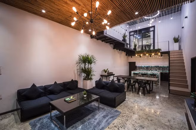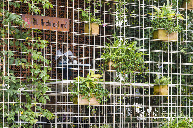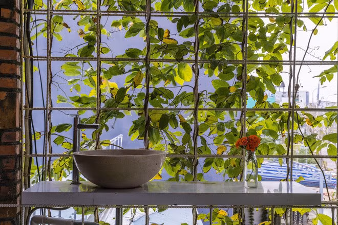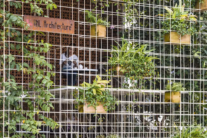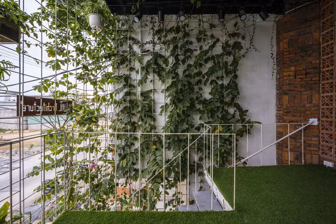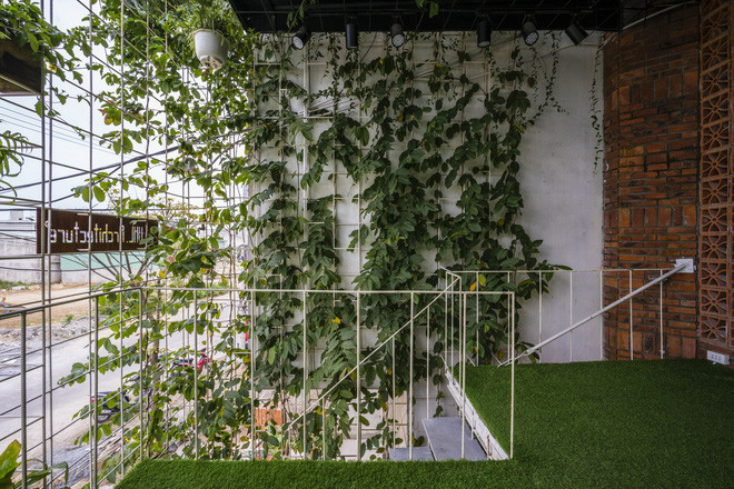 Với ý tưởng biến nhà xưởng cũ nhiều bụi này thành không gian sống bình yên, nhiều cây xanh, các KTS và gia chủ đã có những cải tạo lớn. Cụ thể phần mặt tiền được biến thành bức tường xanh.
