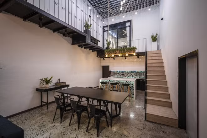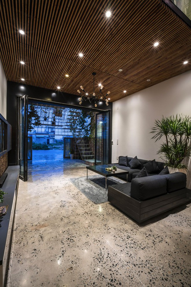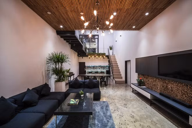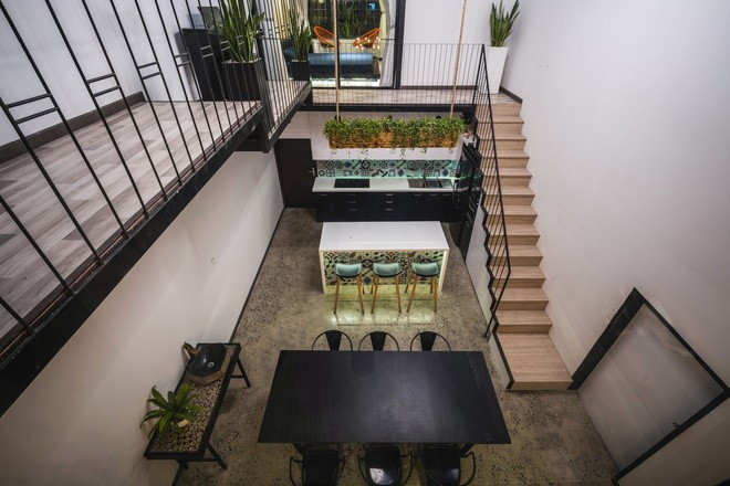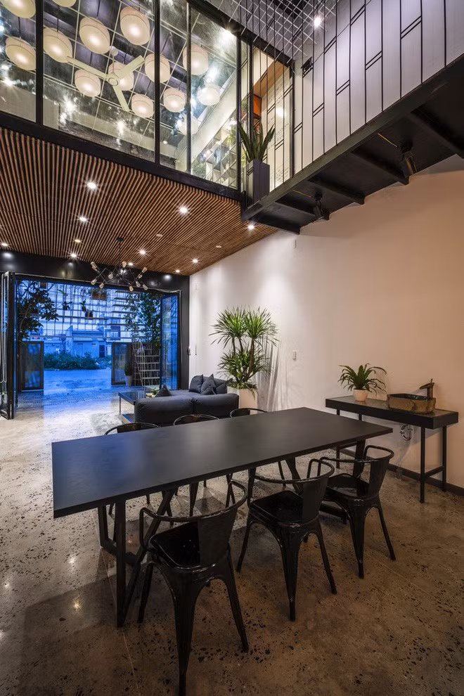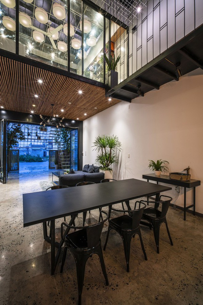 Tầng trệt là không gian phòng khách - ăn thiết kế vừa hiện đại, vừa mộc mạc.