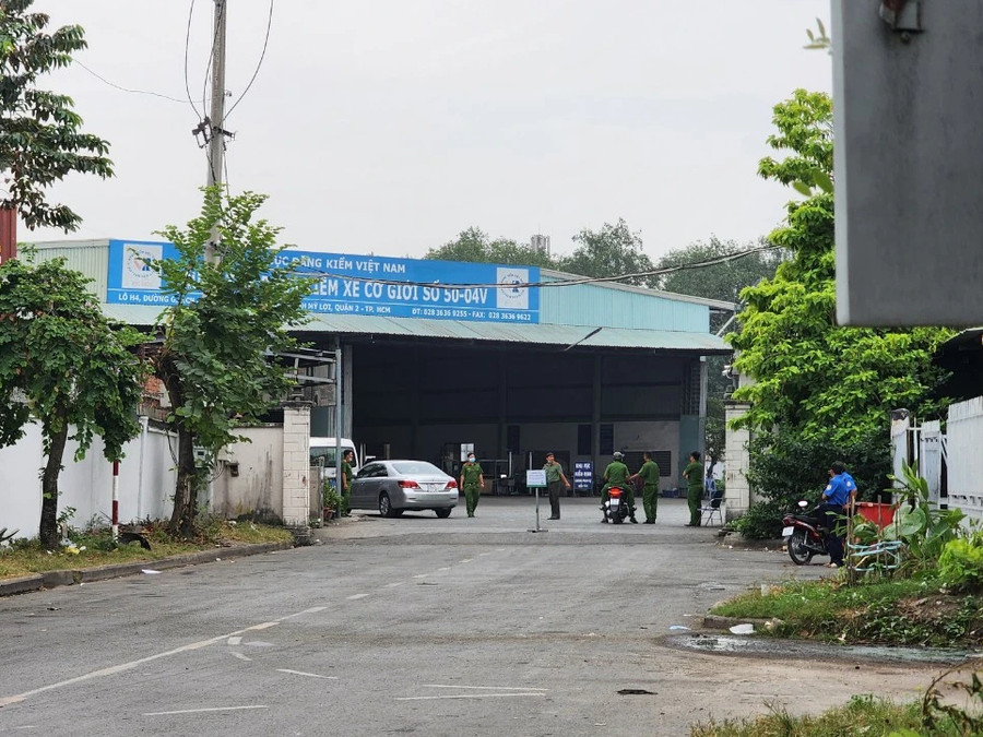 Đến gần 11 giờ trưa cùng ngày, xe ô tô biển số xanh cùng rất đông lực lượng công an vẫn đang có mặt bên trong Trung tâm đăng kiểm 50-04V. Bên cạnh đó, có nhiều người mặc đồng phục của viện kiểm sát cùng phối hợp lực lượng công an thi hành nhiệm vụ.