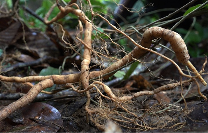 Một củ ba kích dài nửa mét, to bằng ngón tay ở trong rừng.