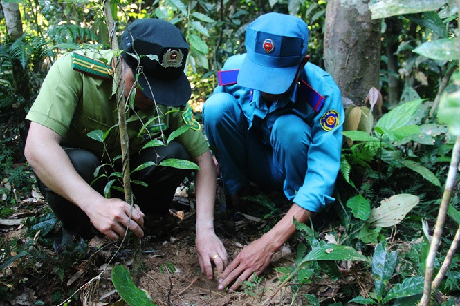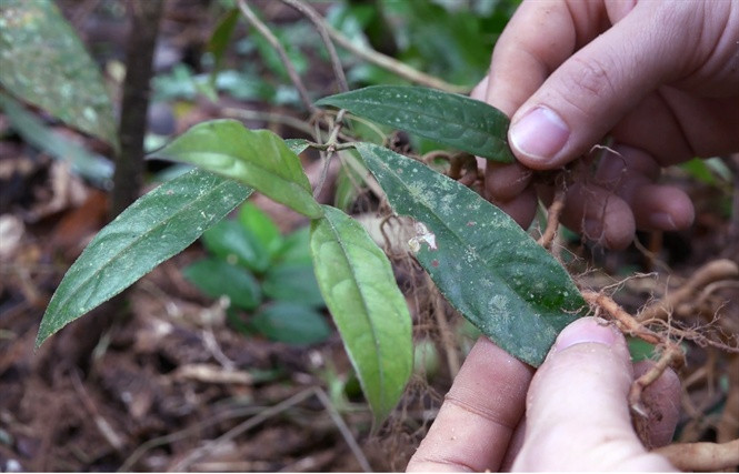 Kiểm lâm và cán bộ bảo vệ rừng kiểm tra một cây ba kích.
