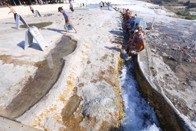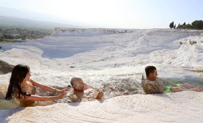 Nhiều người thích thú ngâm mình dưới suối và ngắm nhìn toàn cảnh thành phố Denizli xinh đẹp. Ngay cả những du khách nam cũng không bỏ qua cơ hội đắp mặt nạ bùn khoáng để dưỡng da khi tắm suối.