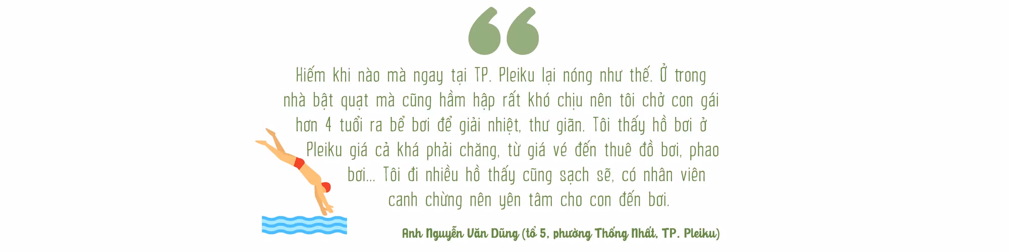 Trao đổi với P.V, ông Nguyễn Xuân Hà-Trưởng phòng Văn hóa-Thông tin TP. Pleiku-cho biết: “Hiện nay, dịch vụ hồ bơi tại TP. Pleiku đang nở rộ, góp phần đẩy mạnh phong trào tập luyện thể dục thể thao nâng cao sức khỏe, nhất là phòng tránh đuối nước ở trẻ em. Để các hồ bơi đảm bảo vệ sinh, an toàn tuyệt đối, chúng tôi phối hợp với các xã, phường thường xuyên kiểm tra, nhắc nhở chủ hồ bơi tuân thủ các quy định. Nhất là trong những ngày nắng nóng và dịp hè sắp tới, lượng người đến hồ bơi đông, các chủ hồ cần có biện pháp hợp lý tránh tình trạng quá tải, mất an toàn”.