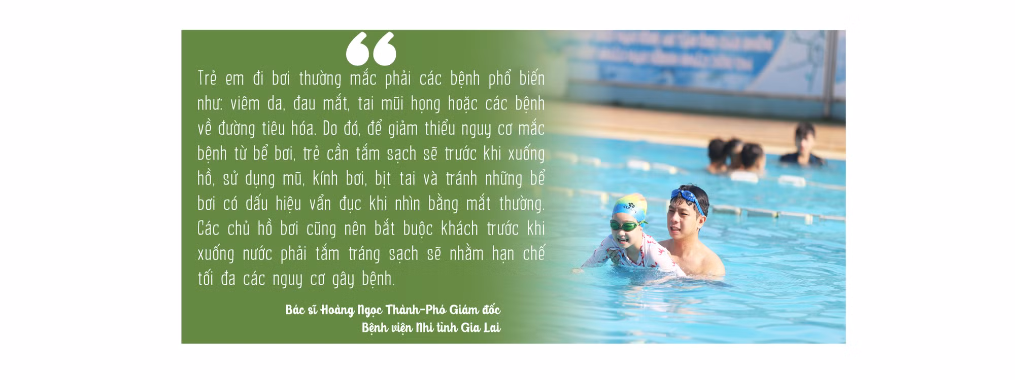 Trong những ngày nắng nóng, bơi là hoạt động yêu thích của đông đảo người dân. Tuy vậy, đến bể bơi công cộng tập trung đông người trong thời gian này cũng tiềm ẩn nguy cơ ảnh hưởng đến sức khỏe, nhất là với trẻ em. Bác sĩ Hoàng Ngọc Thành-Phó Giám đốc Bệnh viện Nhi tỉnh-cho hay: Hầu hết các bể bơi đều phải dùng hóa chất để xử lý nước, phổ biến là Clo. Nếu lạm dụng hoặc sử dụng loại hóa chất không tốt sẽ khiến chất lượng nước bị ảnh hưởng. Những ngày nắng, lượng người đổ về bể bơi càng đông thì càng dễ có nguy cơ mất vệ sinh từ mồ hôi, mỹ phẩm, nước bọt… Một số người không có thói quen tắm trước khi xuống bể bơi cũng mang theo các chất thải chứa mầm bệnh.