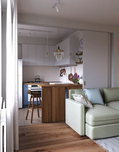 Mọi chi tiết trong nhà bếp được trang trí tối giản, khiến không gian không bị quá chật chội.