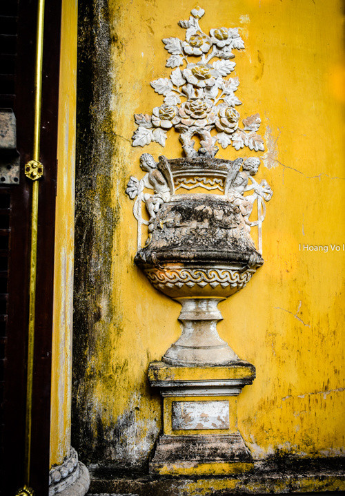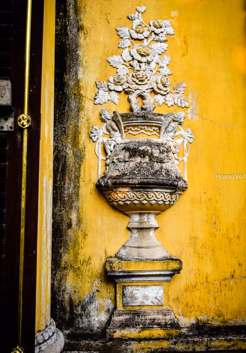 Một hoạ tiết trang trí trên tường trong cung An Định. Quần thể kiến trúc này đánh dấu thời kỳ mỹ thuật Việt Nam bắt đầu chịu ảnh hưởng của phong cách phương Tây, thể hiện qua mọi công trình đều mang phong cách kết hợp giữa đề tài trang trí truyền thống của Việt Nam với các đề tài trang trí châu Âu, tạo nên bức tranh kiến trúc độc đáo.