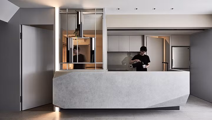 Khu vực nhà bếp cũng được bố trí bằng những hình khối khác nhau, tạo sự đa dạng cho không gian trong nhà.