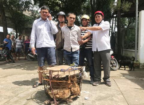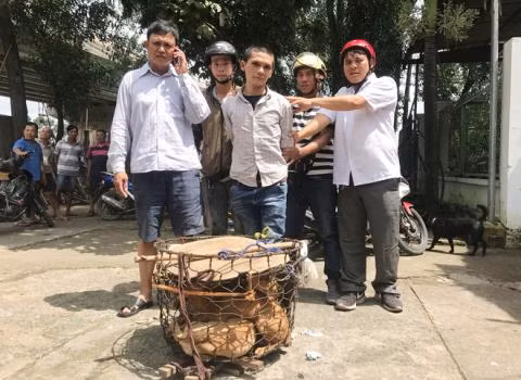 Anh Hải (bìa phải) và các thành viên CLB Phú Hòa bắt nghi can trộm xe máy và lồng chó. Ảnh: TNO