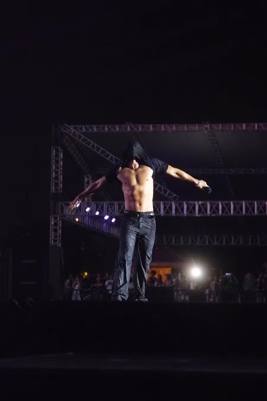 Đến cuối tiết mục, những đợt bắn nước liên tục của lễ hội nhạc nước khiến Hieuthuhai ướt toàn thân. Nam ca sĩ vén áo khoe cơ bụng và thân hình săn chắc để đáp lại sự cổ vũ của khán giả.
