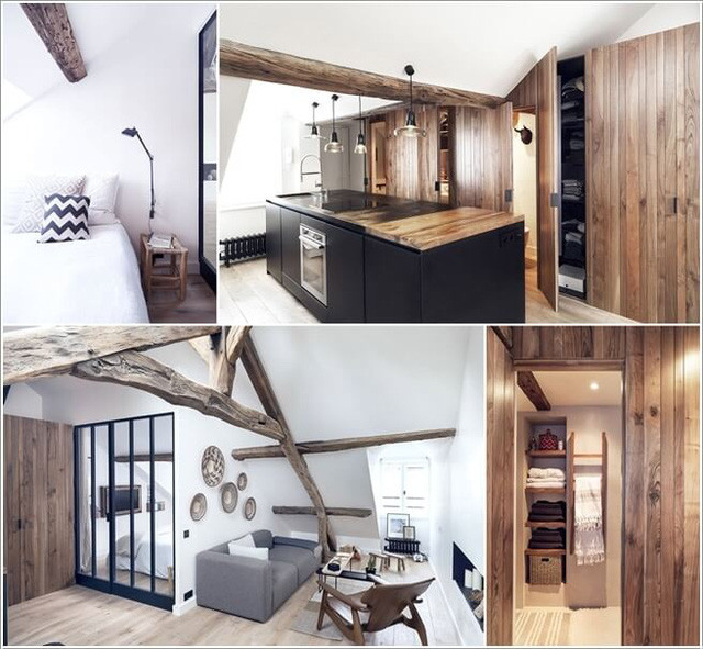 Với những ai yêu thích vẻ đẹp thân thiện, gần gũi với thiên nhiên thì khoảng tường của căn hộ áp mái là nơi tuyệt vời để bạn ốp gỗ. Hoặc bạn cũng có thể sử dụng tủ âm tường màu gỗ tự nhiên để không gian nhỏ thêm bình dị, đẹp hơn.