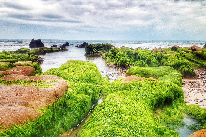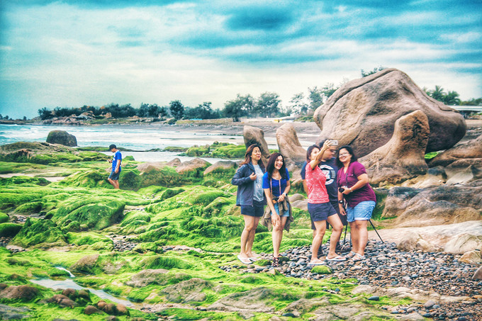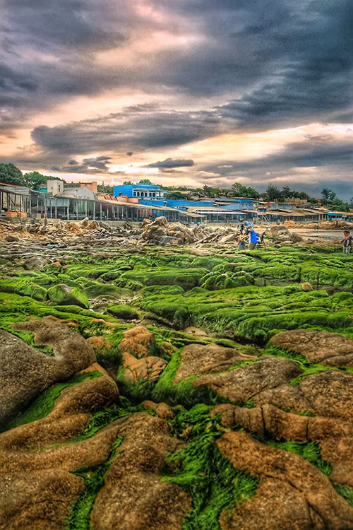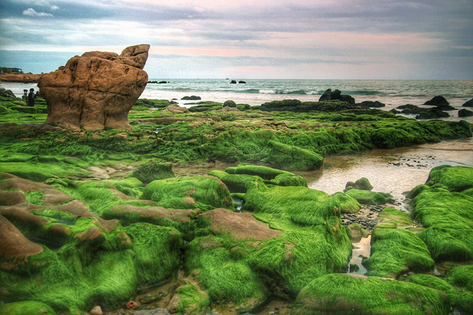 Lớp rong, rêu có màu xanh mướt bám trên bãi đá khiến biển Cổ Thạch trở nên khác lạ, thu hút du khách khắp nơi.