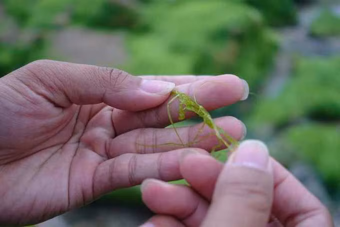 Trên nhiều hòn đá ở Cổ Thạch, lớp bám trên đá thường là rong, ít thấy rêu.
