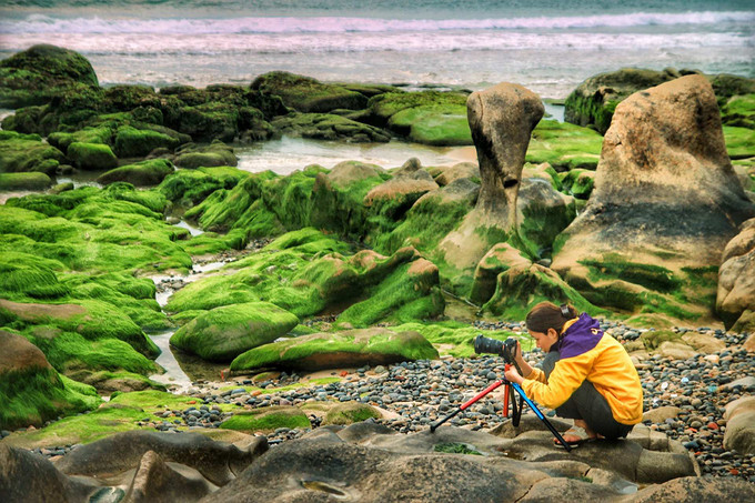 Màu xanh huyền bí ở nơi này tạo ra nguồn cảm hứng lớn cho nhiều tay máy dù chuyên hay không. Để săn được những bức ảnh đẹp cũng không kém phần công phu, bởi mực nước biển lên xuống sẽ gây cản trở tầm nhìn. Nếu mực nước xuống thấp quá sẽ khiến rong, rêu trông khô và mất đi độ mượt mà. Rêu sẽ chuẩn màu khi biển yên lúc sáng sớm hoặc hoàng hôn. Vì vậy, bạn cần lên lịch kỹ từ thời gian cho hành trình "săn rêu" của mình.