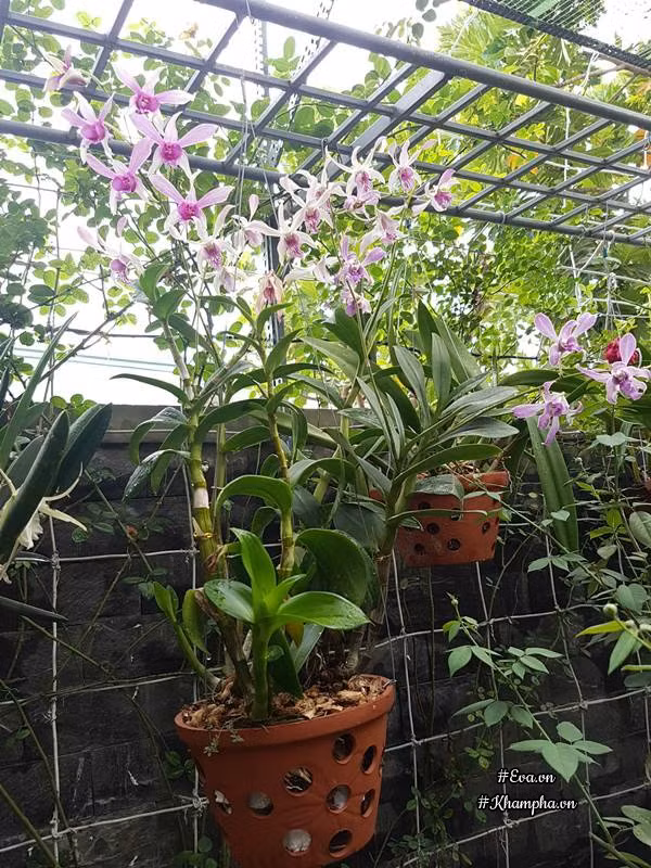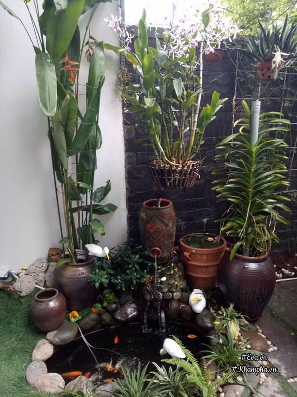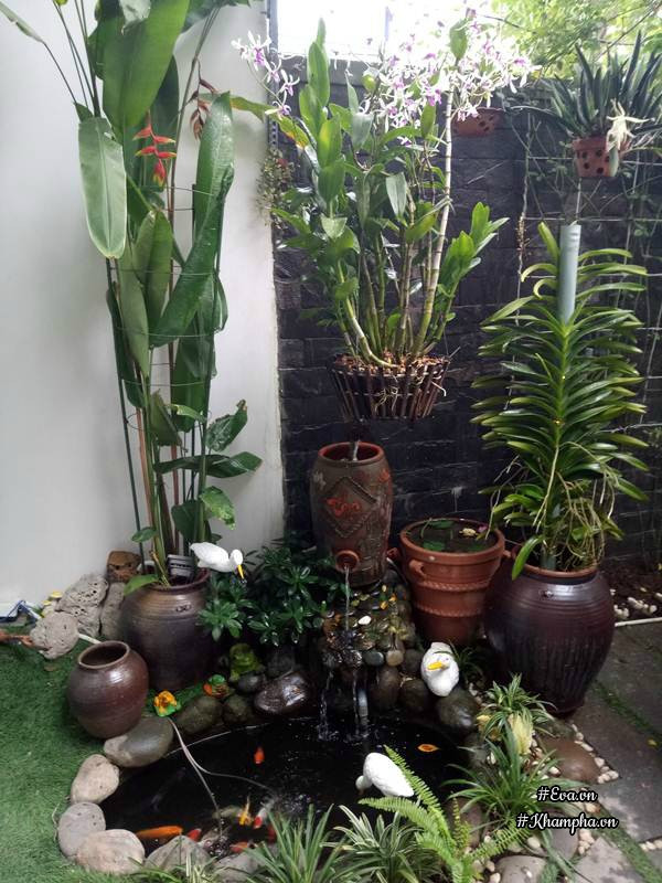Khu vườn của chị Lê Thị Cẩm Thanh tuy nhỏ nhưng luôn ngập tràn hương sắc hoa lan. Chị còn thiết kế được một hồ cá Koi nhỏ rất thơ mộng ngay trong sân.
