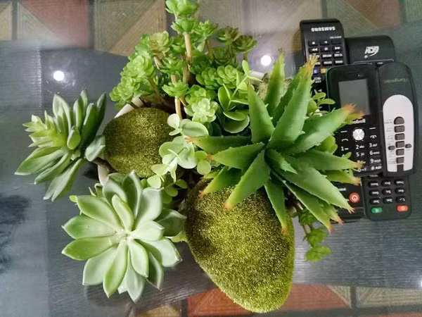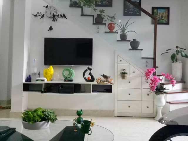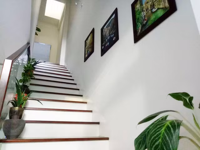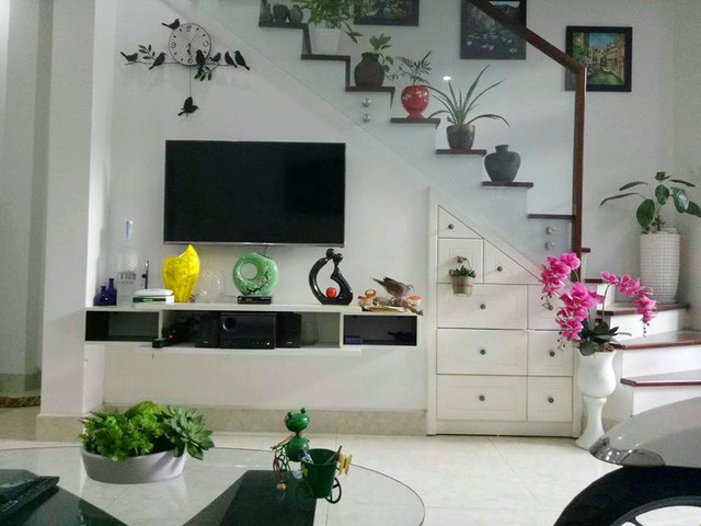 Trong nhà, góc cầu thang cũng được trang trí bằng những chậu hoa nhỏ.