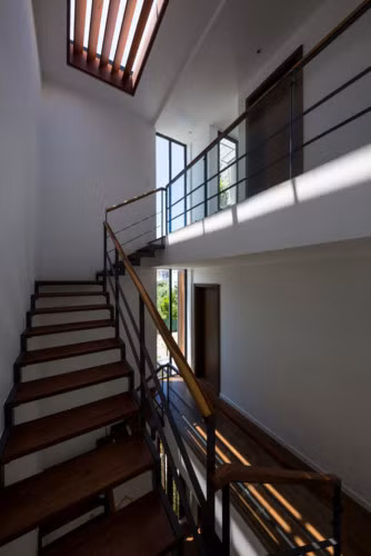 Cầu thang mảnh, vật liệu chính là thép và gỗ.