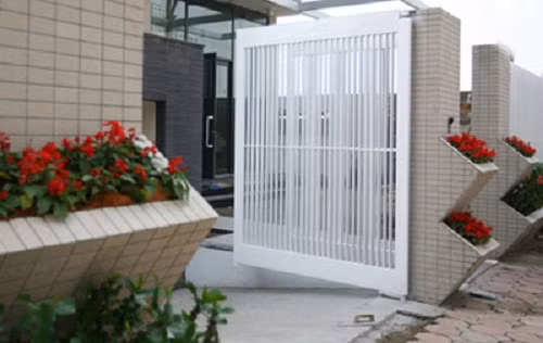 Cổng rào biệt thự 3 tầng sử dụng gam màu trắng sang trọng xen lẫn bồn hoa tươi.
