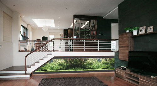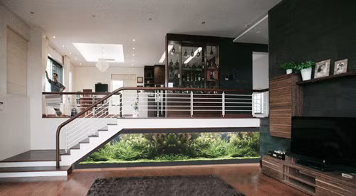 Khu vực tầng hầm sử dụng bể các vừa trang trí vừa là vách ngăn giữa gara và các không gian công cộng.