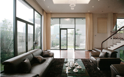 Phòng khách với hệ thống tường kính bao quanh tạo sự thông thoáng.