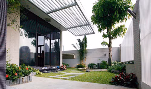 Sử dụng tấm chắn nắng, tường kính bao quanh là giải pháp giúp ngôi biệt thự 3 tầng dù hướng chính Tây vẫn vô cùng thoáng đãng và mát mẻ. Thêm nữa, thiết kế mái vòm cũng giúp ngôi nhà tránh được bức xạ nhiệt.