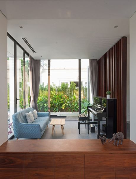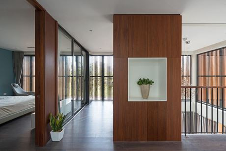 Hệ thống lam gỗ được sử dụng triệt để, từ cổng tới toàn bộ mặt tiền, giúp thông gió, hạn chế ánh nắng và đảm bảo độ riêng tư cho gia chủ.
