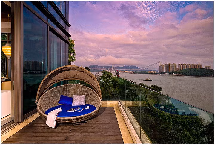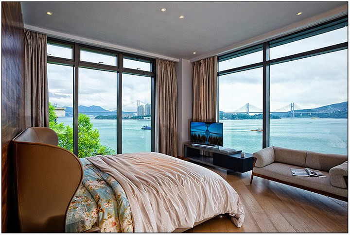 Thiết kế phòng ngủ hướng ra sông, tận dụng hết mức khoảng không gian giá trị nhờ sử dụng tường kính cao sát trần.