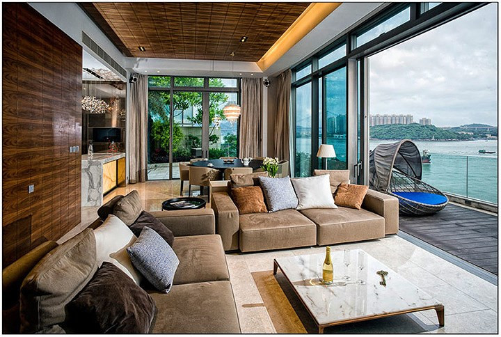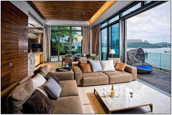 Phòng khách với đồ nội thất tiện nghi và nhìn ra bên ngoài. Mặt tiền sử dụng cửa kính trượt lớn, khiến ngôi nhà đẹp long lanh và tràn ngập ánh sáng.