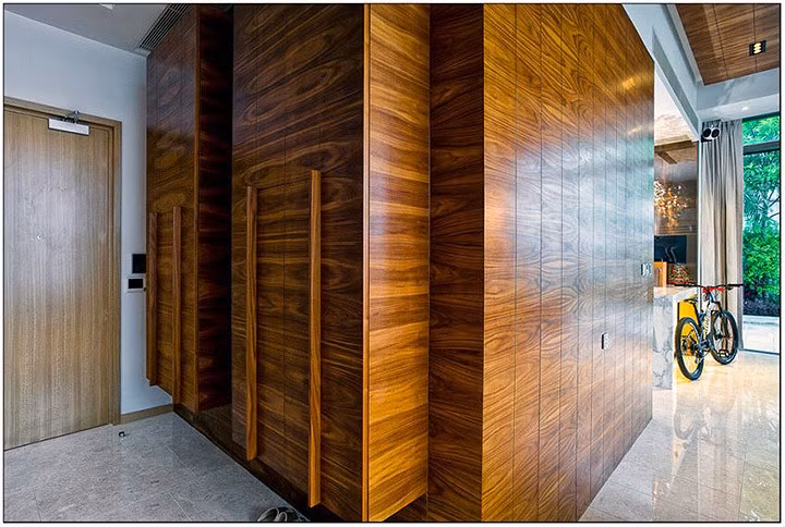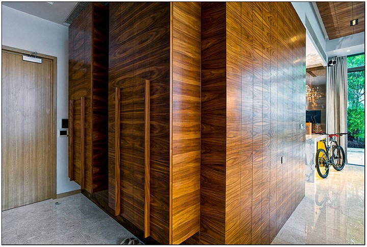 Lối vào với những bức tường bằng gỗ và sàn đá cẩm thạch. Ngôi nhà hai tầng, với ba phòng ngủ và bốn phòng tắm, phòng khách và ban công bên ngoài ngoài. Phía trên là sân thượng và bể bơi ngoài trời.