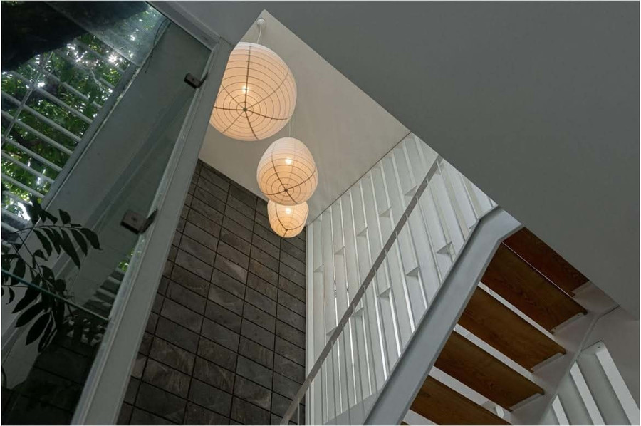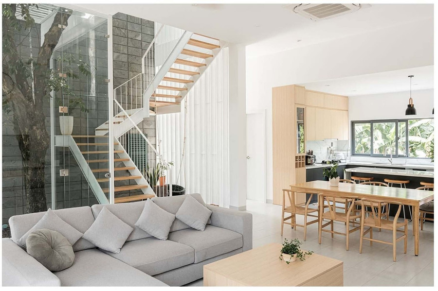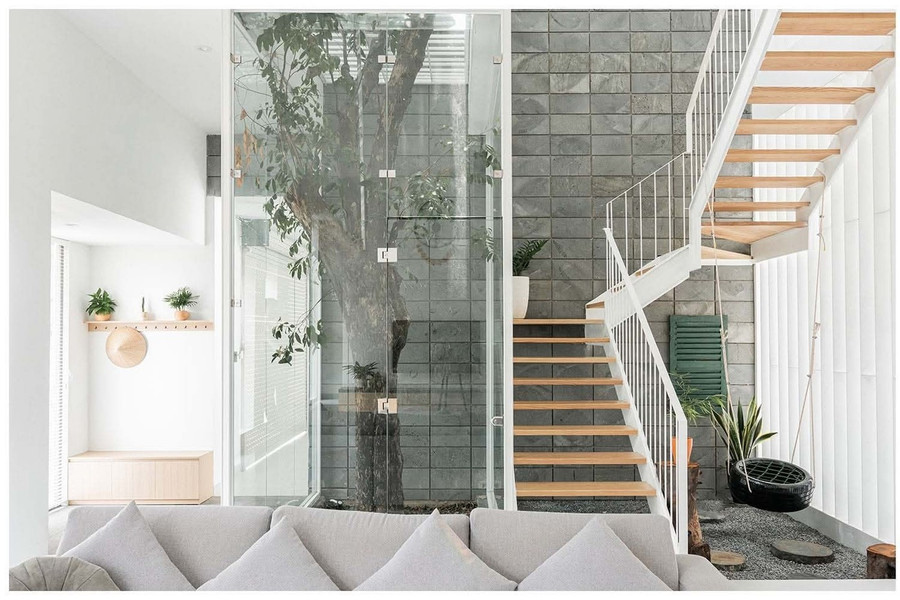 Điểm nhấn của công trình là giếng trời với cây xanh lớn bên cạnh cầu thang, vừa đem thiên nhiên vào nhà vừa lấy sáng và khí trời từ trên cao xuống. Mỗi bước chân lên cao là một góc ngắm nhìn mới với thiên nhiên được mở ra.