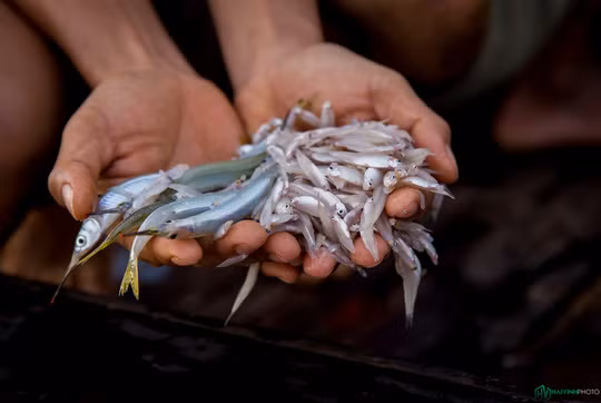 Thành quả sau một đêm ủi vó của một ngư dân trong làng chài. Những con cá cơm được phân loại ra dùng làm thức ăn nuôi cá lớn, cá kìm, phơi khô chiên hay nướng đều rất ngon.