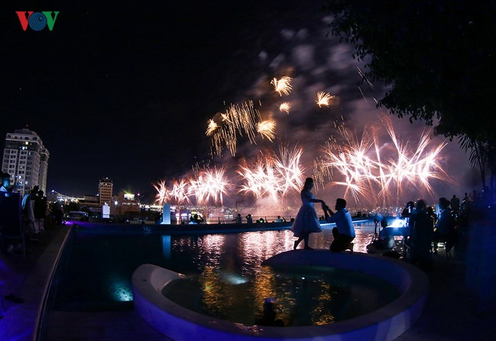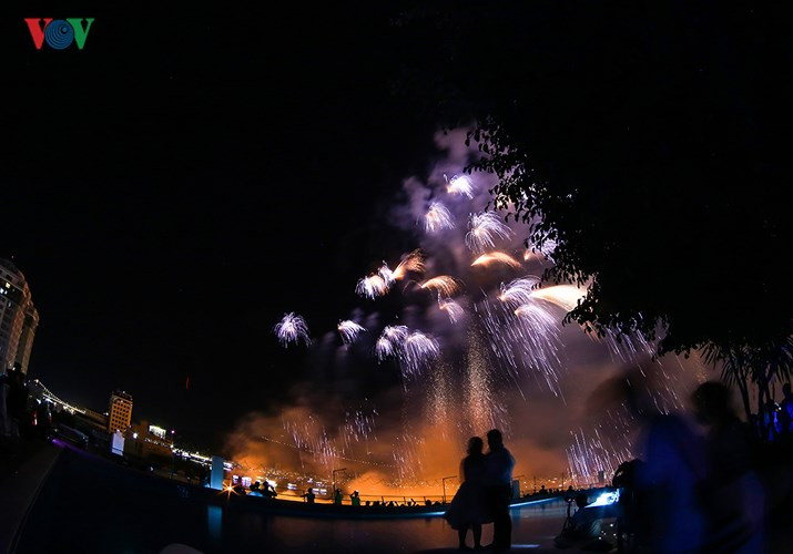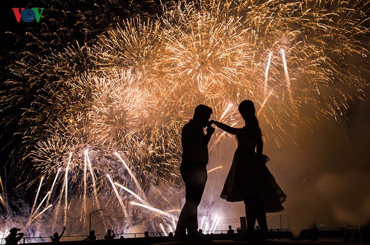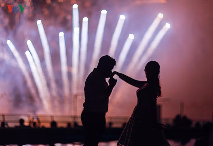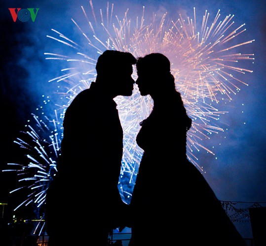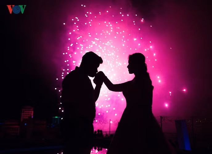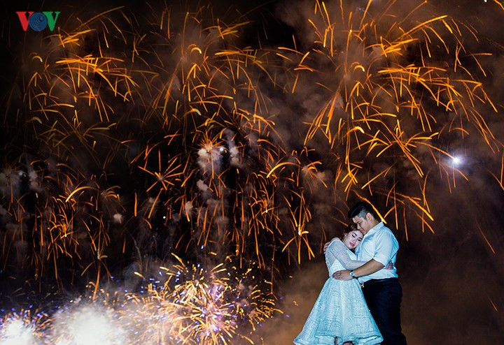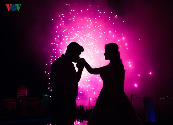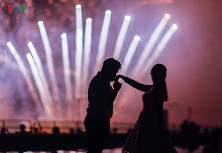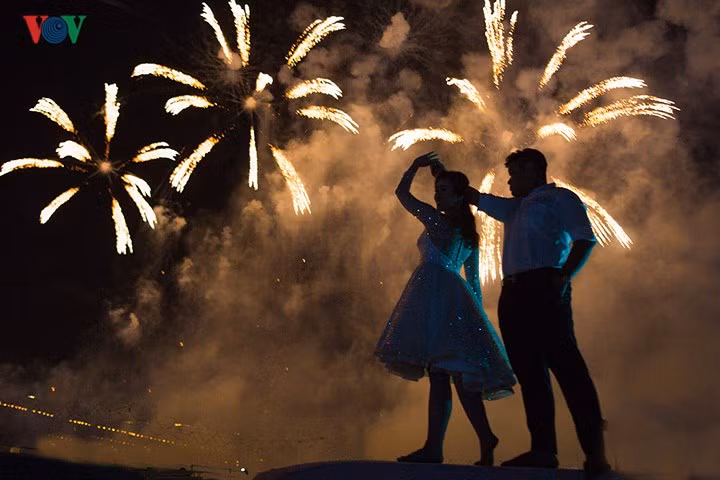 Từ điểm cao của khách sạn Novotel bên bờ Tây sông Hàn, cặp đôi Tín Ngô- Thảo Anh lung linh hơn trong sắc màu những đợt pháo của đội Hong Kong- Trung Quốc.